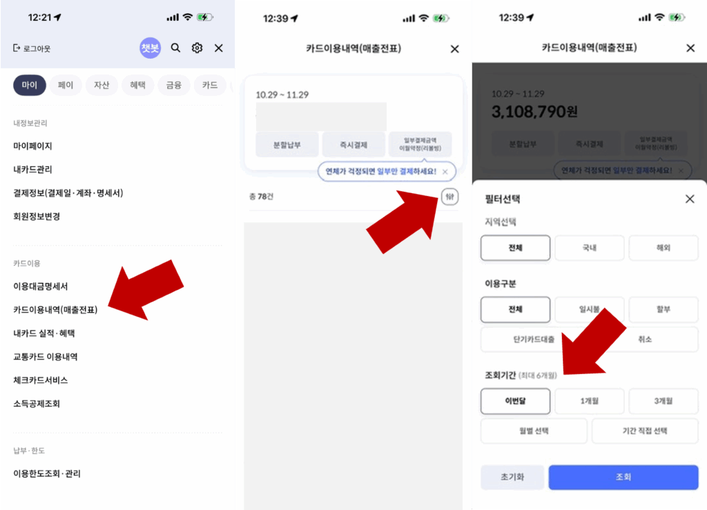 6개월 이내의 이용내역은 카드이용내역에서 바로 조회가 가능합니다.