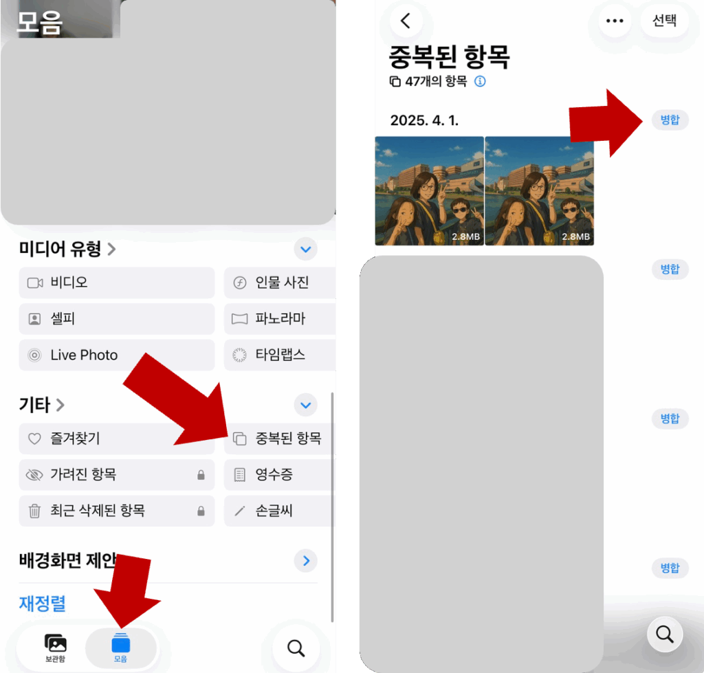 아이폰 사진 앱을 열고 모음 탭을 선택 후 아래로 스크롤하면 기타 섹션이 나타납니다. 여기서 중복된 항목(Duplicates) 메뉴가 보이면 시스템이 라이브러리 내 중복사진을 자동으로 감지한 상태입니다.